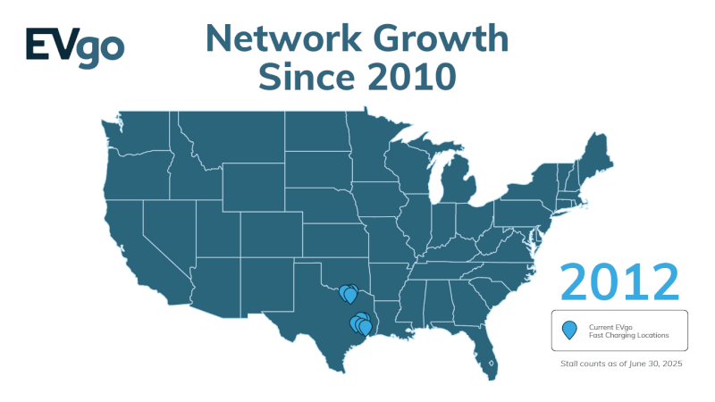 EVgo (and EVgo eXtend) network expansion 2012-2015-2020-2025 | Credit: EVgo