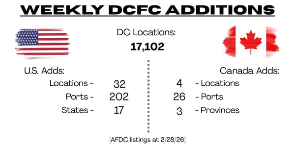 News - Fast-charging additions slowed markedly last week, with 40% fewer stations opened compared to the previous week. Blizzard conditions might have slowed activity in the Northeast and Mid-Atlantic, while delayed data from Tesla also leaves a gap between accelerated Supercharger additions and what is shown in the AFDC listing. This leaves us watching for a spring surge in new DCFC locations, as regions thaw out and delayed construction is completed.