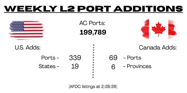 Numbers - 408 L2 charging ports added to the Alternative Fuels Data Center this week, spread across 19 states and 6 Canadian provinces.